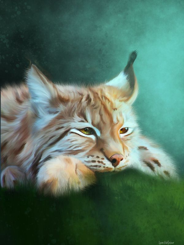 The lynx is one of my absolute favorite animals, and in need of protection due to their dwindling population, especially here in Norway. The Eurasian lynx can be quite a secretive creature....The sounds it makes are very low and often not heard, and their presence in an area can go unnoticed for years. My hope is that these beautiful and elusive cats will be allowed to thrive and that they can all sleep in peace, just as sweetly as the one I have drawn here.